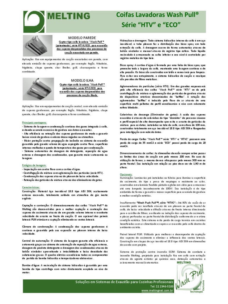 - Maior proteção contra propagação de incêndio no sistema de exaustão Perda de carga: Coifas “Wash Pull”® série “HTV” e “HTVC” possuem uma