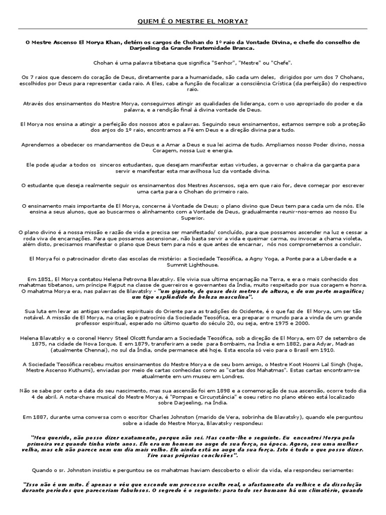 notável. A missão de El Morya, na criação e patrocínio da Sociedade Teosófica, era preparar o mundo para a vinda de um grande