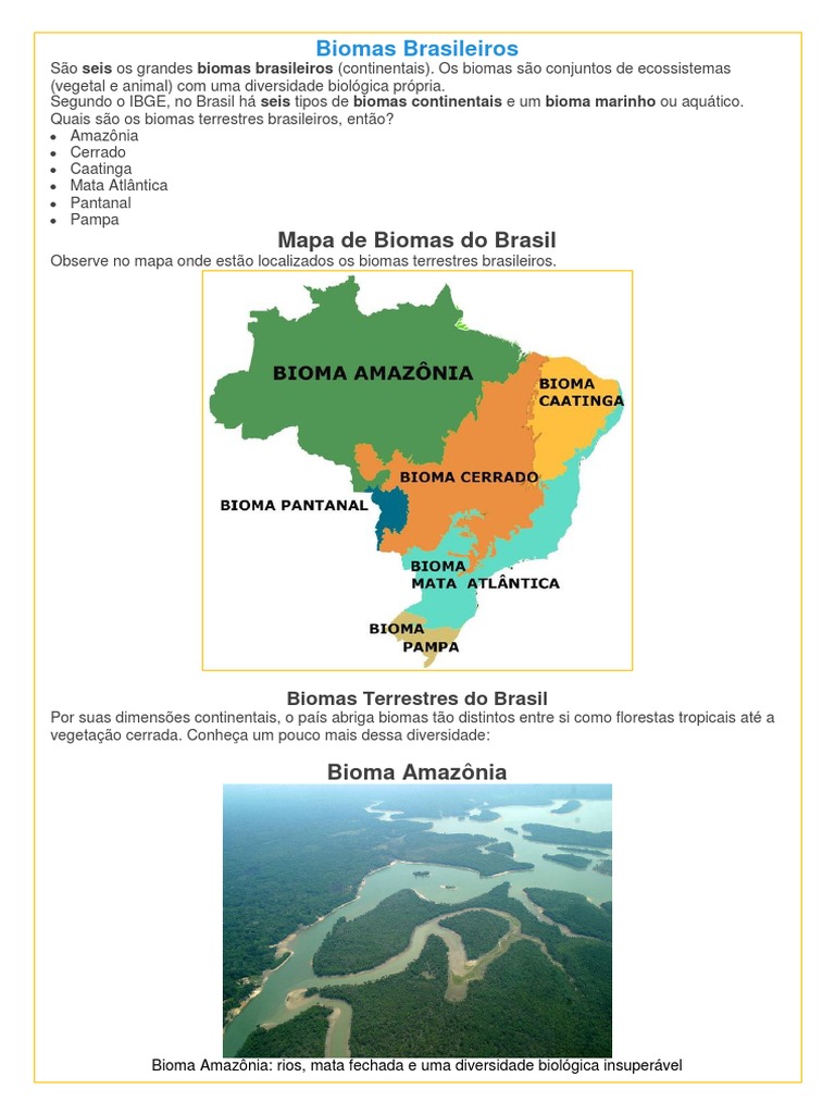 Segundo o IBGE, no Brasil há seis tipos de biomas continentais e um bioma marinho ou aquático.
