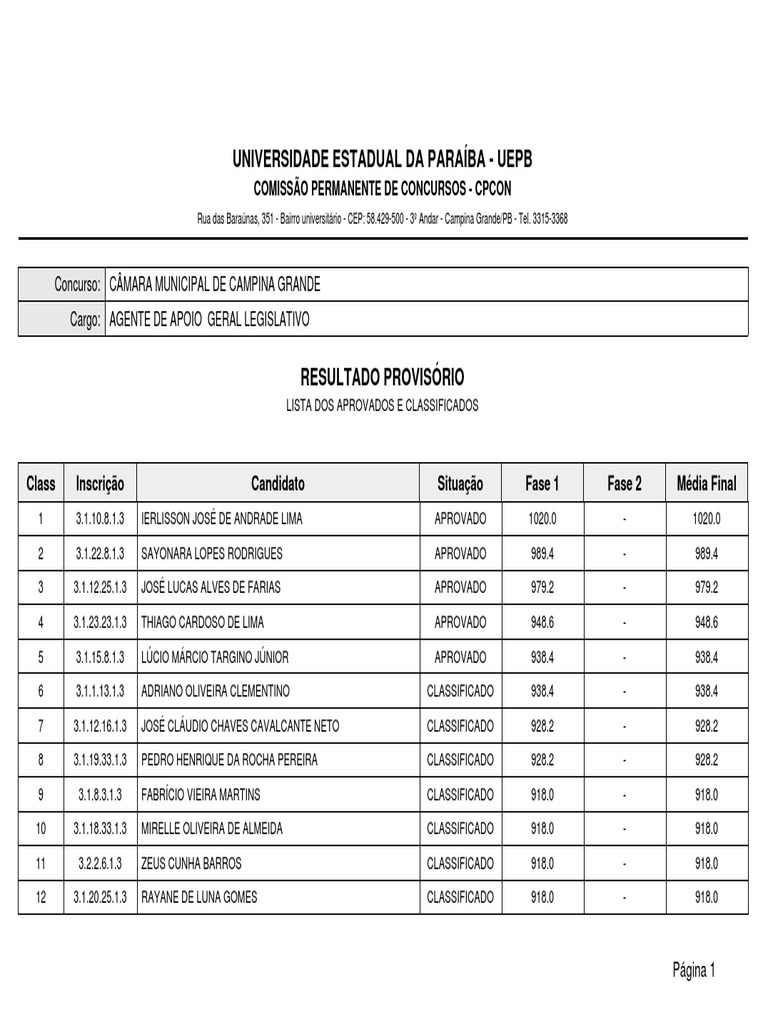 Class Inscrição Candidato Situação Fase 1 Fase 2 Média Final