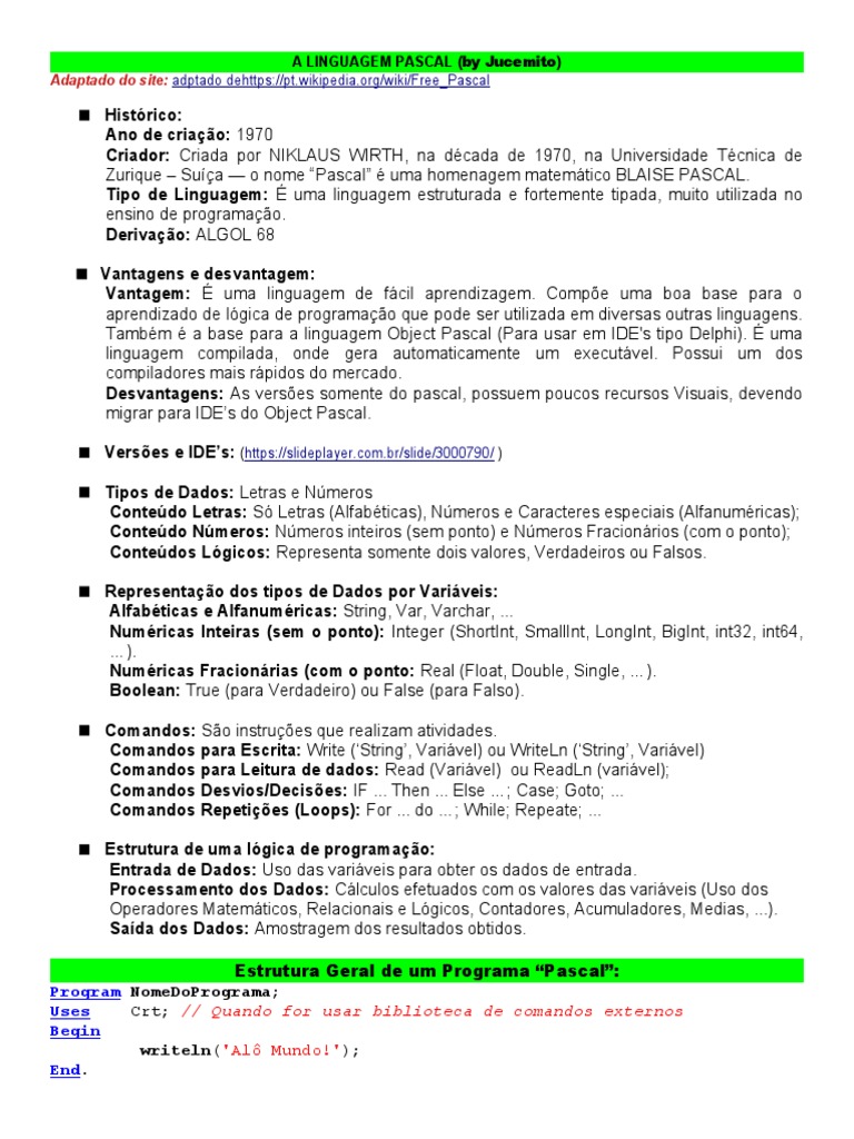 Também é a base para a linguagem Object Pascal (Para usar em IDE's tipo Delphi). É uma