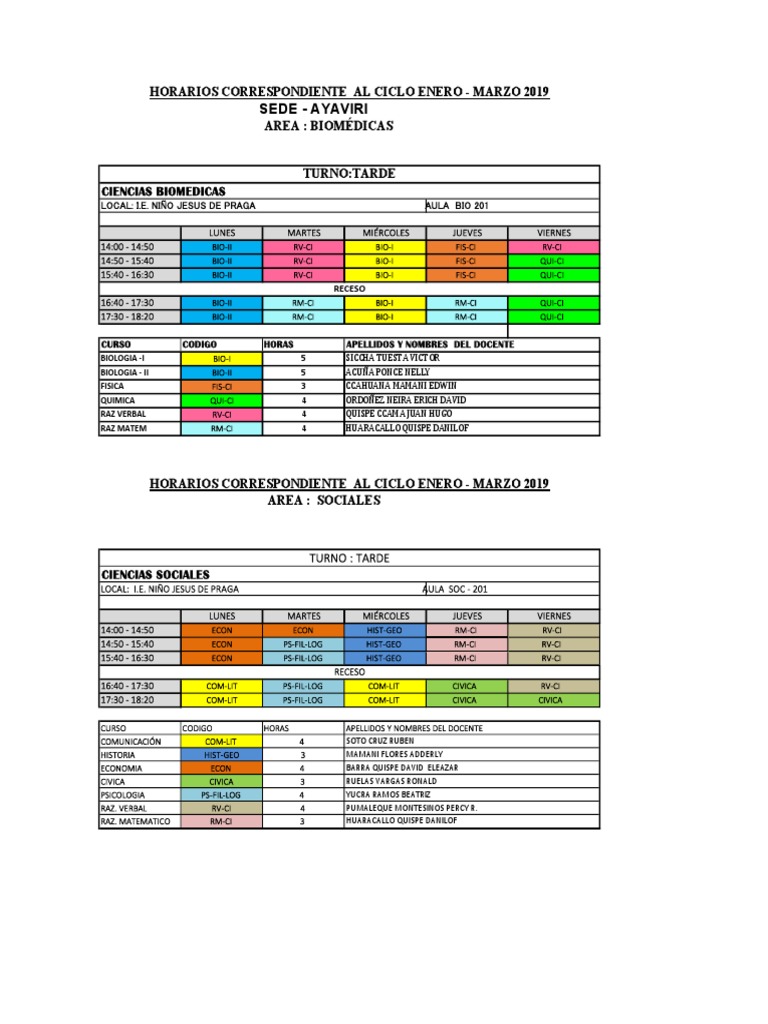 HORARIOS CORRESPONDIENTE AL CICLO ENERO - MARZO 2019