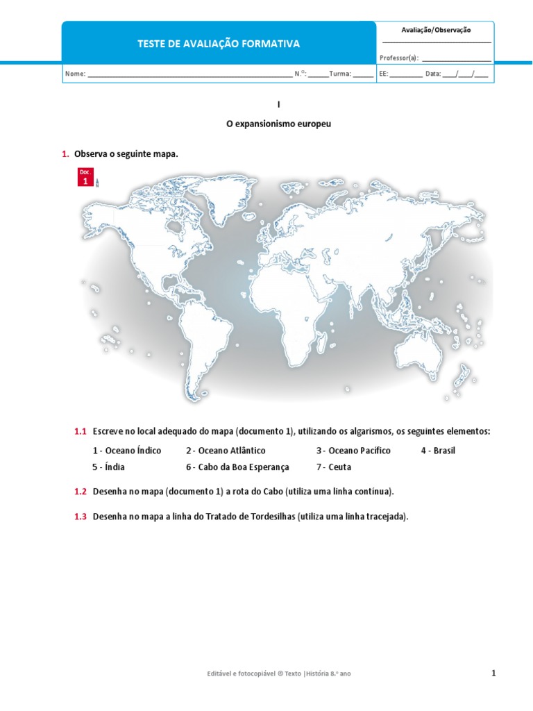 1.3 Desenha no mapa a linha do Tratado de Tordesilhas (utiliza uma linha tracejada).