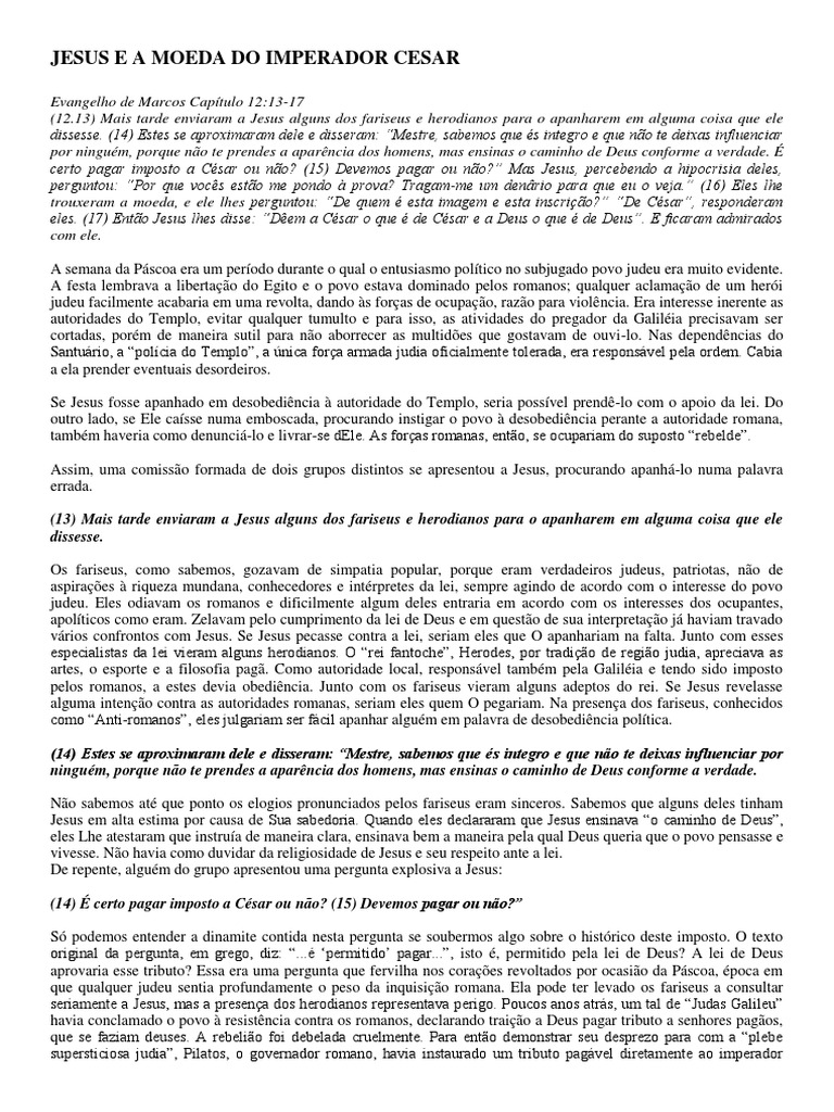 (17) “Então Jesus lhes disse: “Dêem a César o que é de César e a Deus o que é de Deus”.