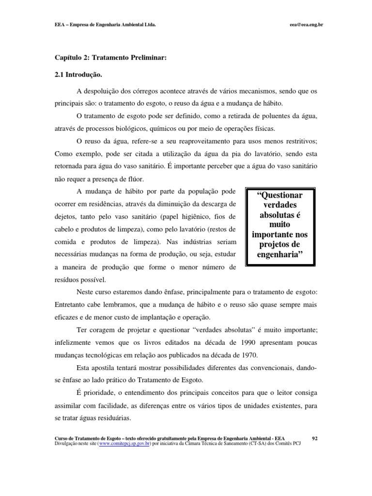 Curso de Tratamento de Esgoto – texto oferecido gratuitamente pela Empresa de Engenharia Ambiental - EEA 92