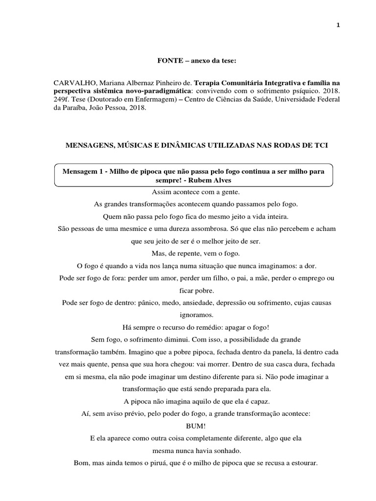CARVALHO, Mariana Albernaz Pinheiro de. Terapia Comunitária Integrativa e família na