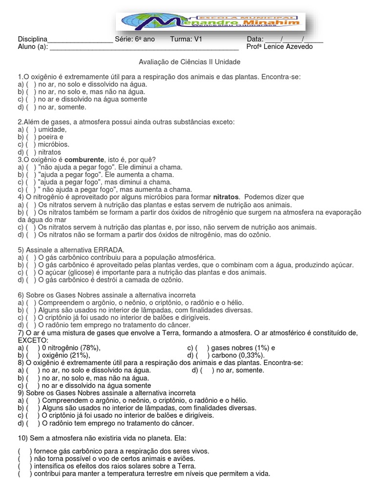 a) ( ) 0 nitrogênio (78%), c) ( ) gases nobres (1%) e