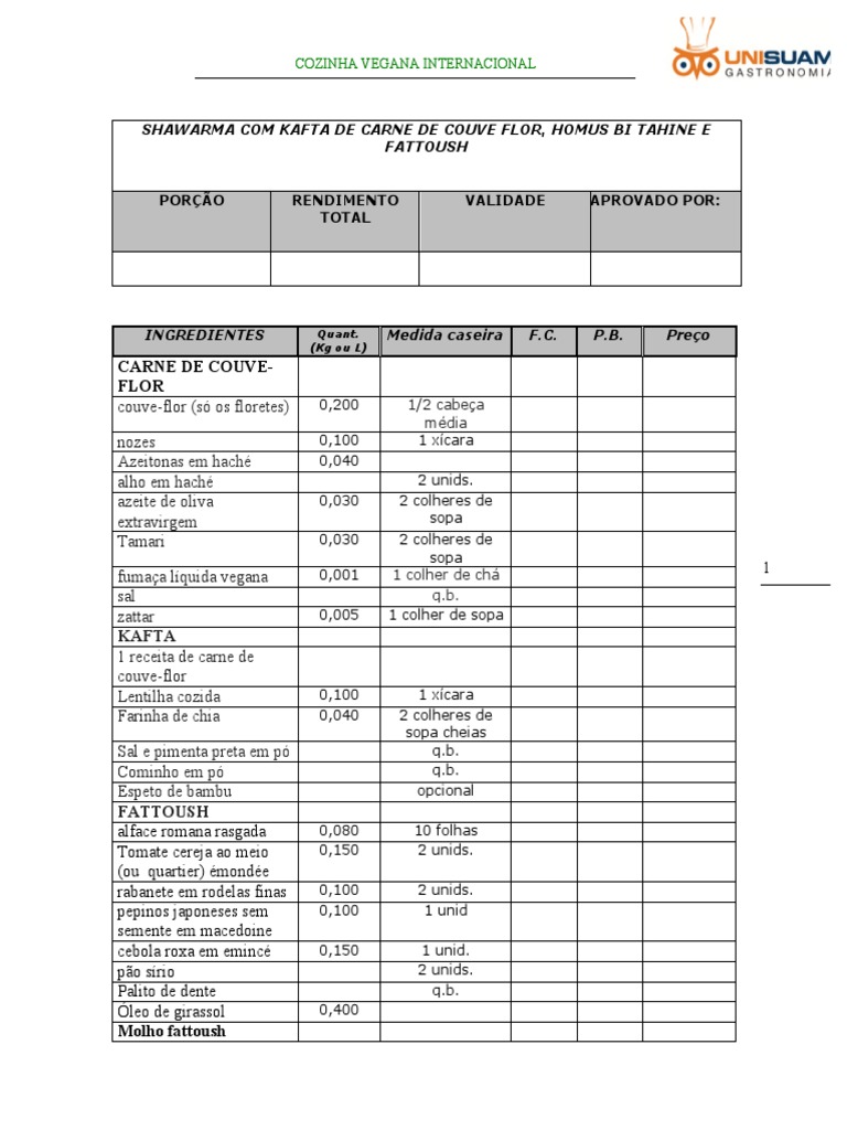 INGREDIENTES Quant. Medida caseira F.C. P.B. Preço
