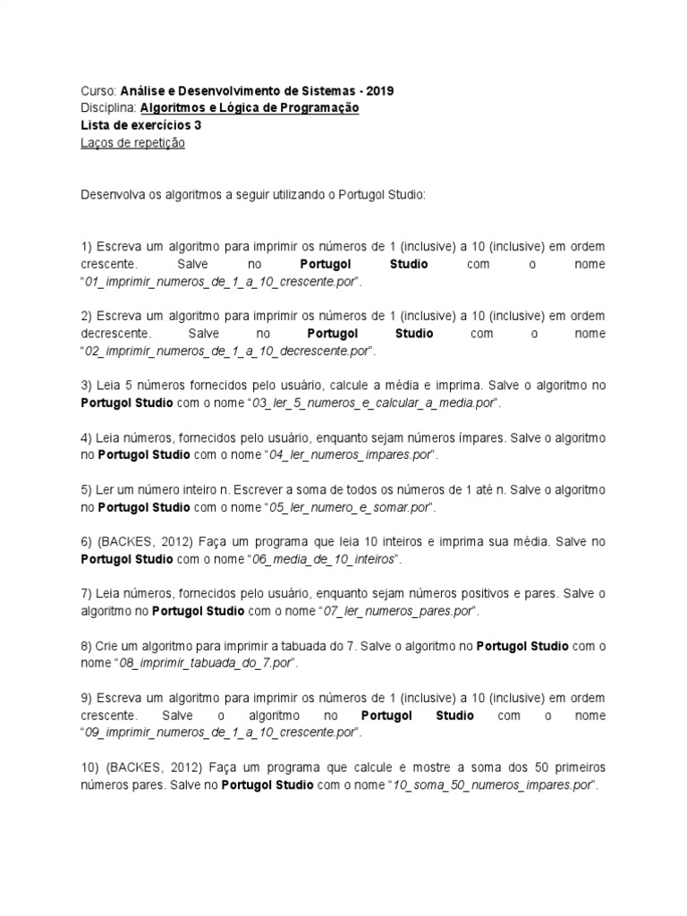 1) Escreva um algoritmo para imprimir os números de 1 (inclusive) a 10 (inclusive) em ordem