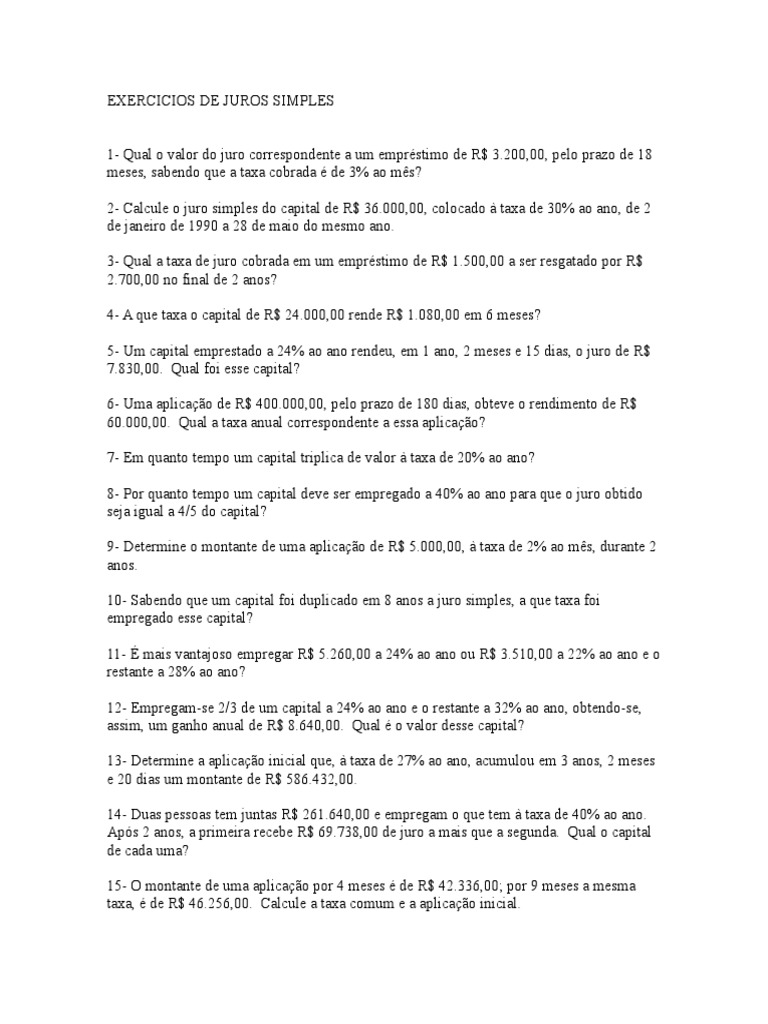 1- Qual o valor do juro correspondente a um empréstimo de R$ 3.200,00, pelo prazo de 18