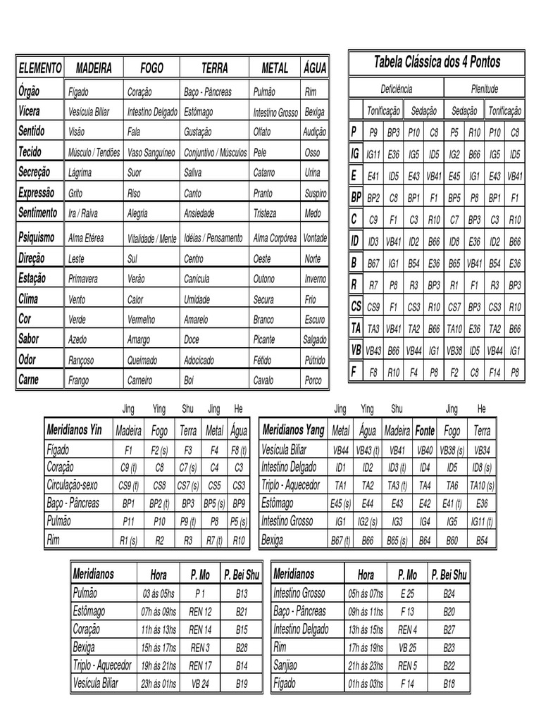 ELEMENTO MADEIRA FOGO TERRA METAL ÁGUA Tabela Clássica dos 4 Pontos
