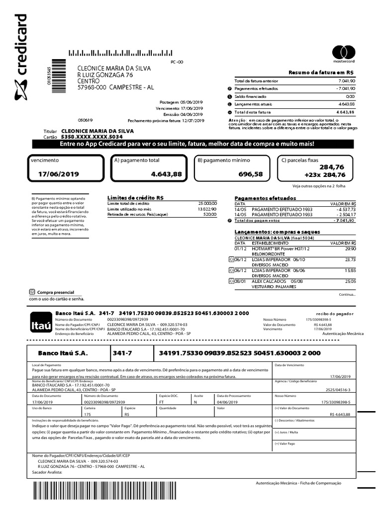 Nome do Beneficiário/CPF/CNPJ BANCO ITAUCARD S.A - 17.192.451/0001-70 Vencimento 17/06/2019