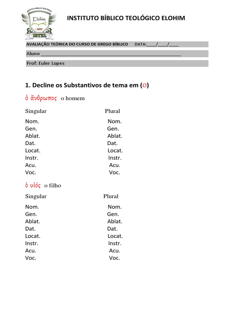 AVALIAÇÃO TEÓRICA DO CURSO DE GREGO BÍBLICO DATA:____/____/____