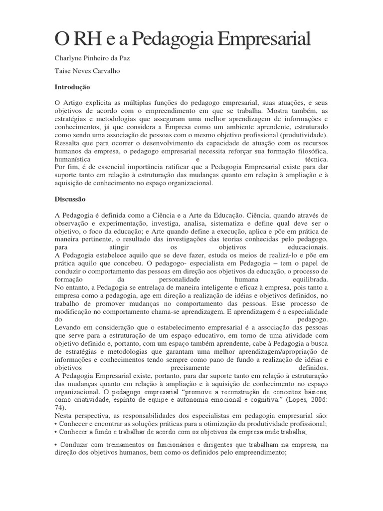 O Artigo explicita as múltiplas funções do pedagogo empresarial, suas atuações, e seus