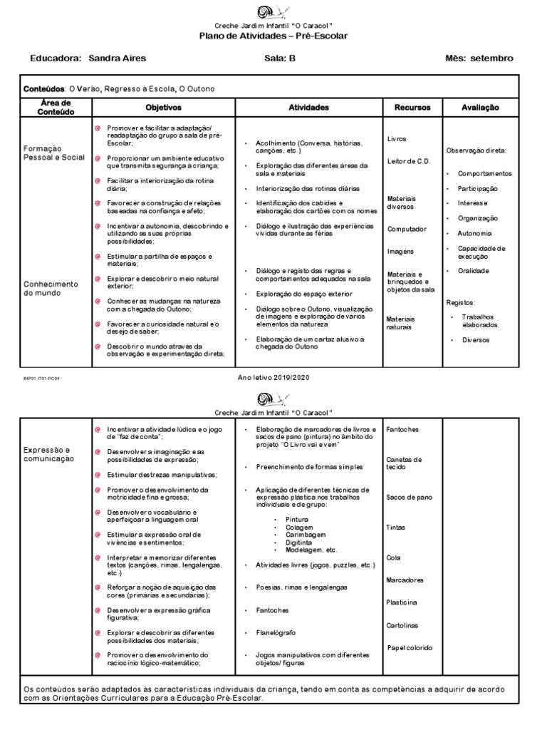 Educadora: Sandra Aires Sala: B Mês: setembro