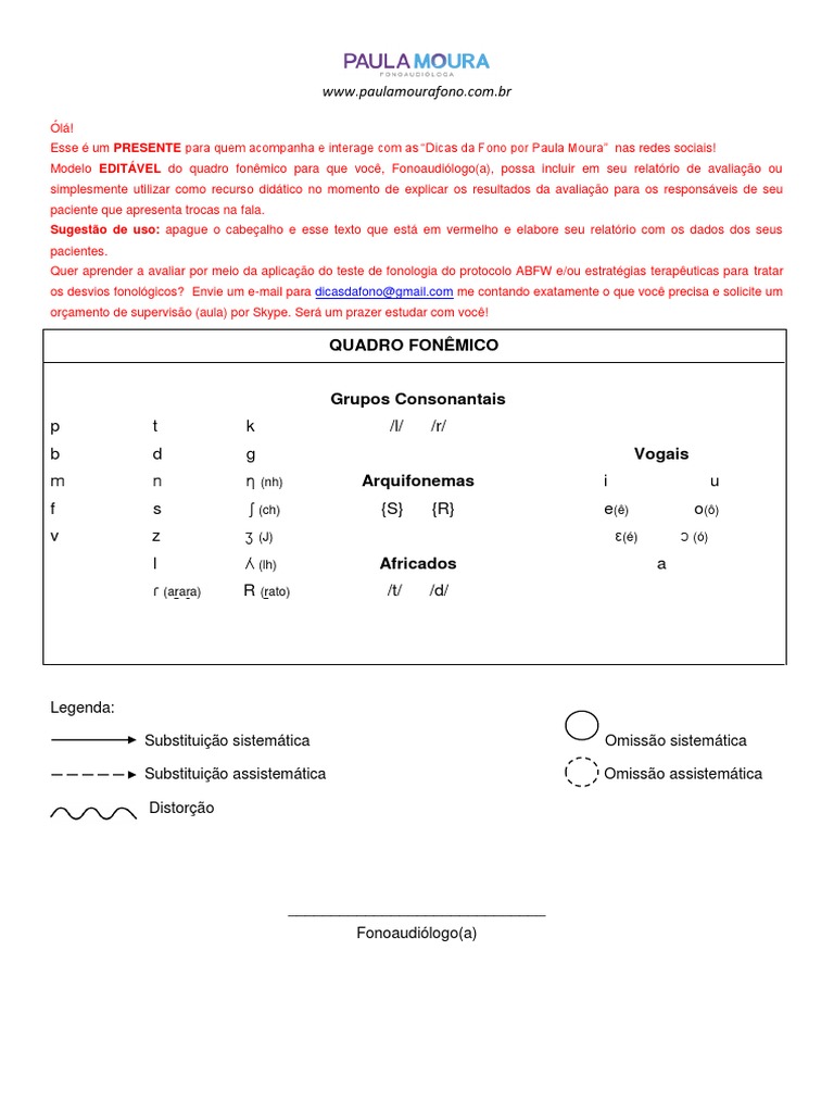 Modelo EDITÁVEL do quadro fonêmico para que você, Fonoaudiólogo(a), possa incluir em seu relatório de avaliação ou