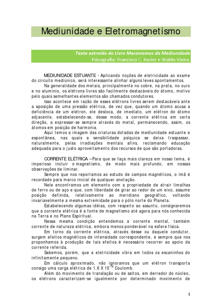 FERROMAGNETISMO E MEDIUNIDADE – Após ligeiros apontamentos sobre circuitos elétricos e efeitos magnéticos. seja de teor purgativo ou de elevada situação. em estágios curtos ou longos na reencarnação terrestre. segregadas em aflitivo desajuste nas reencarnações reparadoras por se haverem onerado perante a Lei. mesmo naquelas de sensibilidade mediúnica normal. tanto maior quanto mais vasta a descompensação. campo esse. Perceberemos nas mentes ajustadas aos imperativos da experiência humana. ao passo que. o cobalto. criaturas em que os “spins” ou efeitos magnéticos da atividade espiritual se evidenciam necessariamente harmonizados. nas organizações mentais em que os “spins” ou efeitos magnéticos do pensamento apareçam descontrabalançados. embora em outro sentido. o que ocorre tanto com as grandes almas que aceitam ministérios de abnegação e renúncia em planos inferiores. em vista de reter a imanização remanente. a transparecer no trabalho expiatório da alma que se rendeu à delinqüência ou na ação missionária dos Espíritos de eleição que se entregam à bem-aventurança do sacrifício por amor. como também com as almas menos enobrecidas. plasmando condições mediúnicas variáveis por exigirem o auxílio de correntes de força que lhes ofereçam o necessário equilíbrio. o aço. como sejam o ferro. com possibilidades de ampliação. seja nas atividades que se relacionam com o exercício do bem ou naquelas que se reportam à prática do mal. o níquel e as ligas que lhes dizem respeito. pois. aí permanecendo em posição de desnível.Sem obstáculo. Vemos. que mantém a imanização apenas no curso de tempo em que se acha submetido à ação magnetizante. reconhecemos que a mediunidade ou capacidade de sintonia está em todas as criaturas. que as mentes integralmente afinadas com a esfera física possuem campo magnético reduzido. com o objetivo de trazerem das Esferas Superiores mais alta contribuição de progresso ao pensamento da Humanidade. presidindo a formação dos “domínios” ou ímãs diminutos do mundo íntimo em processo de integração. DESCOMPENSAÇÃO VIBRATÓRIA . as propriedades magnéticas patenteiam teor avançado. porque todas as criaturas são dotadas de campo magnético particular. através do qual o campo magnético se mostra entrosado às emoções comuns. porém. que é sempre mais pronunciado nas pessoas que estejam temporariamente em regime de “descompensação vibratória”. depois de cessada a ação referida. e o aço temperado. merecendo especial atenção o ferro doce. surpreendemos no ferromagnetismo um ponto expressivo para o estudo da mediunidade. 3 . as chamadas substâncias magnéticas naturais e ainda aquelas que podem adquirir semelhantes qualidades.camada periférica se evidenciam descompensados ou naqueles que estejam sob regime de excitação. que se demora imanizado por mais tempo. artificialmente. Possuímos na Terra. ao passo que aquelas situadas em condições anômalas guardam consigo campo magnético mais vasto.