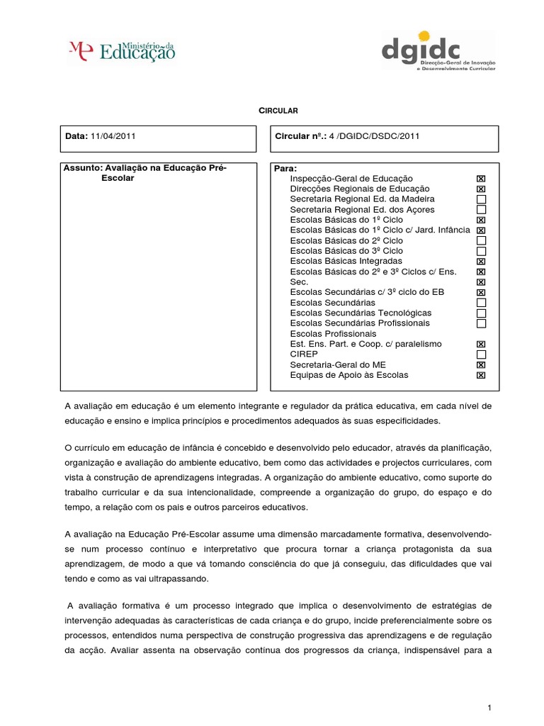 I - Enquadramento Normativo As principais orientações normativas relativas à avaliação na Educação Pré-Escolar estão consagradas no Despacho nº 5220/97 de 4 de Agosto (Orientações Curriculares para a Educação Pré-Escolar) e no Ofício Circular nº 17/DSDC/DEPEB/2007, de 17 de Outubro da DGIDC (Gestão do Currículo na Educação Pré-escolar). As orientações neles contidas articulam-se com o Decreto-Lei nº 241/2001 de 30