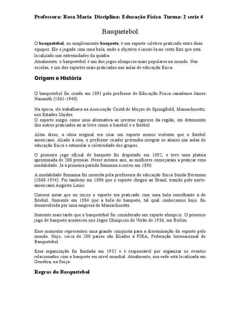 futebol. Somente em 1984 que a bola de basquete, tal qual conhecemos hoje, foi