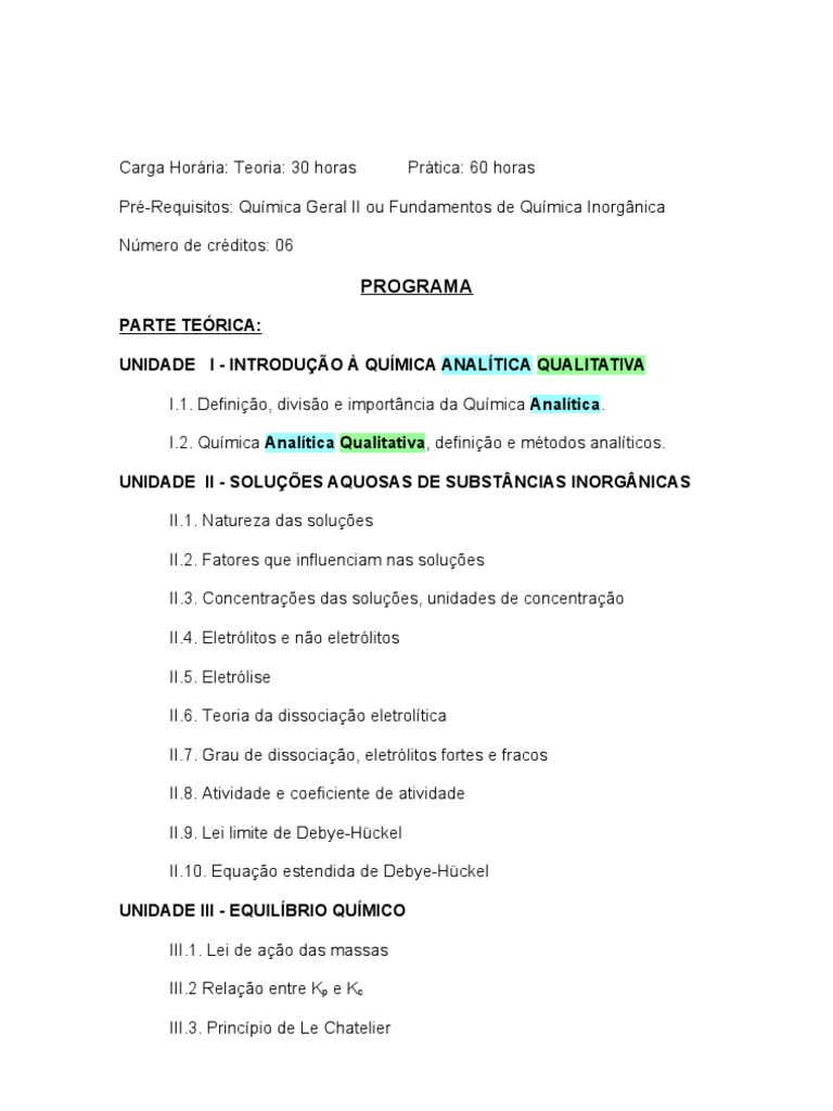 UNIDADE I - INTRODUÇÃO À QUÍMICA ANALÍTICA QUALITATIVA