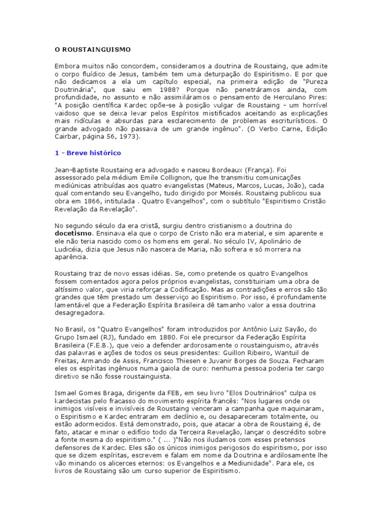 uma das piores deturpações do Espiritismo. (O Verbo e a Carne. O homem espírita verdadeiro e esclarecido converte-se no homem da era ante-cristã. O Conselho Federativo Nacional. Seria triste.Pois bem. Seus membros não têm a menor autonomia. é subordinado à FEB. Terminamos este capítulo com as corajosas palavras de Herculano: "É dever dos espíritas sinceros combater a mistificação roustainguista neste alvorecer da Era Espírita no Brasil. que continua maliciosamente a ser feita. A doutrina do futuro nega-se a si mesma e mergulha nas trevas mentais do passado. apoiado nas Obras Básicas de Allan Kardec e nos estudos de seus mais fiéis seguidores. contra o roustainguismo. Ary Lex . que congrega as entidades espíritas de todos os Estados do Brasil. página 60) Esta é a nossa posição. que se transforma num processo de deturpação mitológica do Cristianismo. Ou arrancamos o joio da seara ou seremos coniventes na deturpação doutrinária. O Cristo agênere é a ridicularização do Espiritismo. se não fosse ridículo. no crente simplório das velhas mitologias".