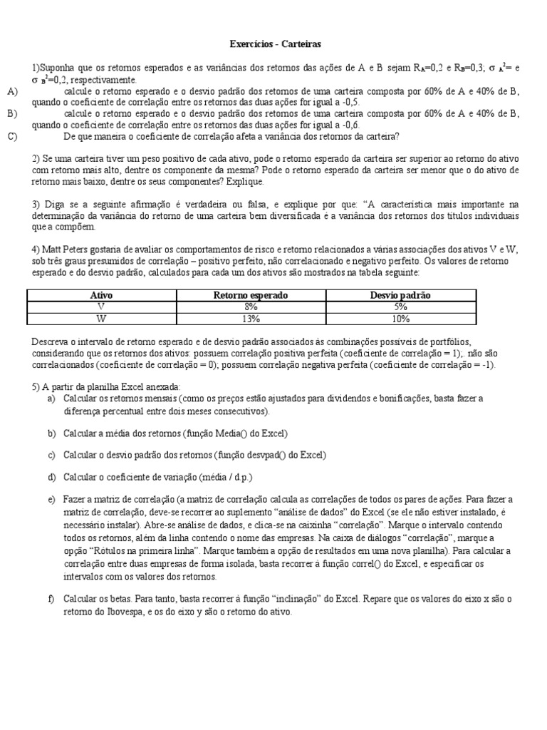 1)Suponha que os retornos esperados e as variâncias dos retornos das ações de A e B sejam R A=0,2 e RB=0,3; σ A2= e