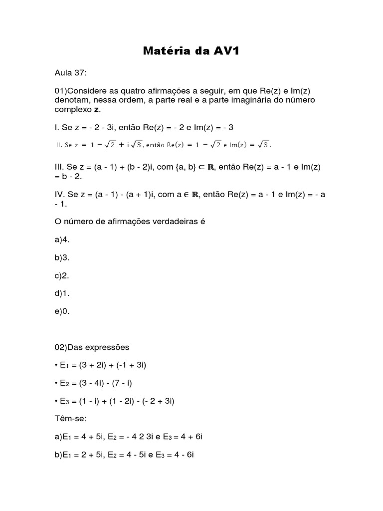 01)Considere as quatro afirmações a seguir, em que Re(z) e Im(z)