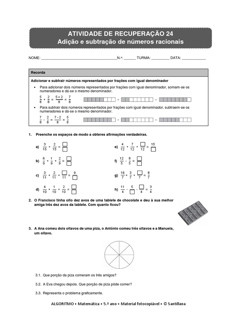 Adicionar e subtrair números representados por frações com igual denominador