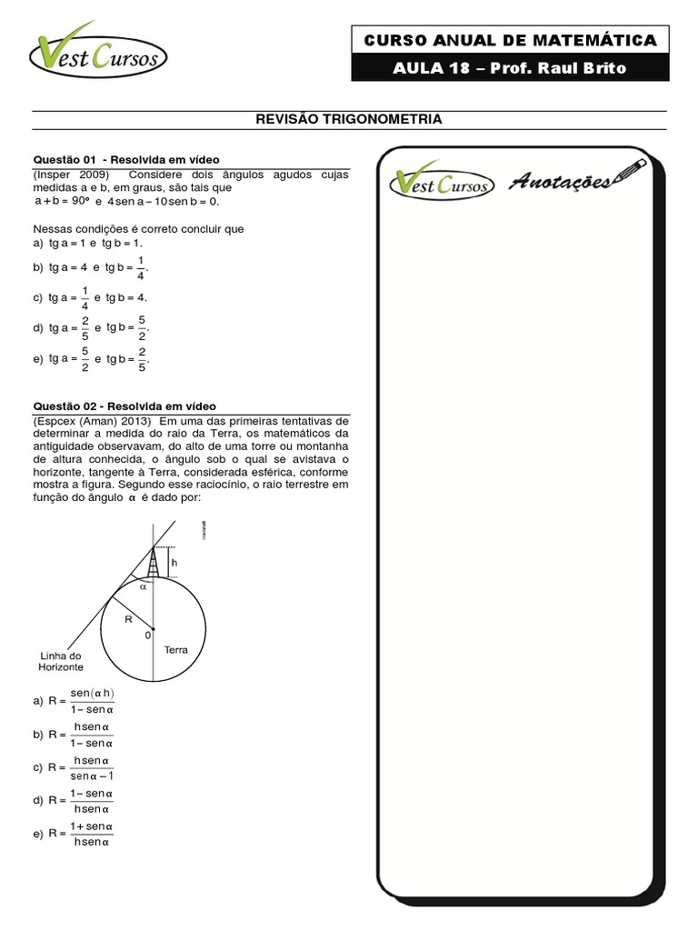 CURSO DE MATEMÁTICA ANUAL – AULA 18 – Prof. Raul Brito REVISÃO TRIGONOMETRIA