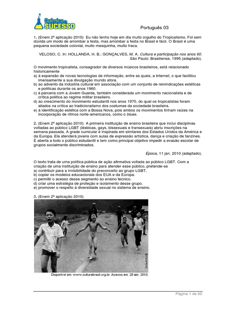 1. (Enem 2ª aplicação 2010) Eu não tenho hoje em dia muito orgulho do Tropicalismo. Foi sem