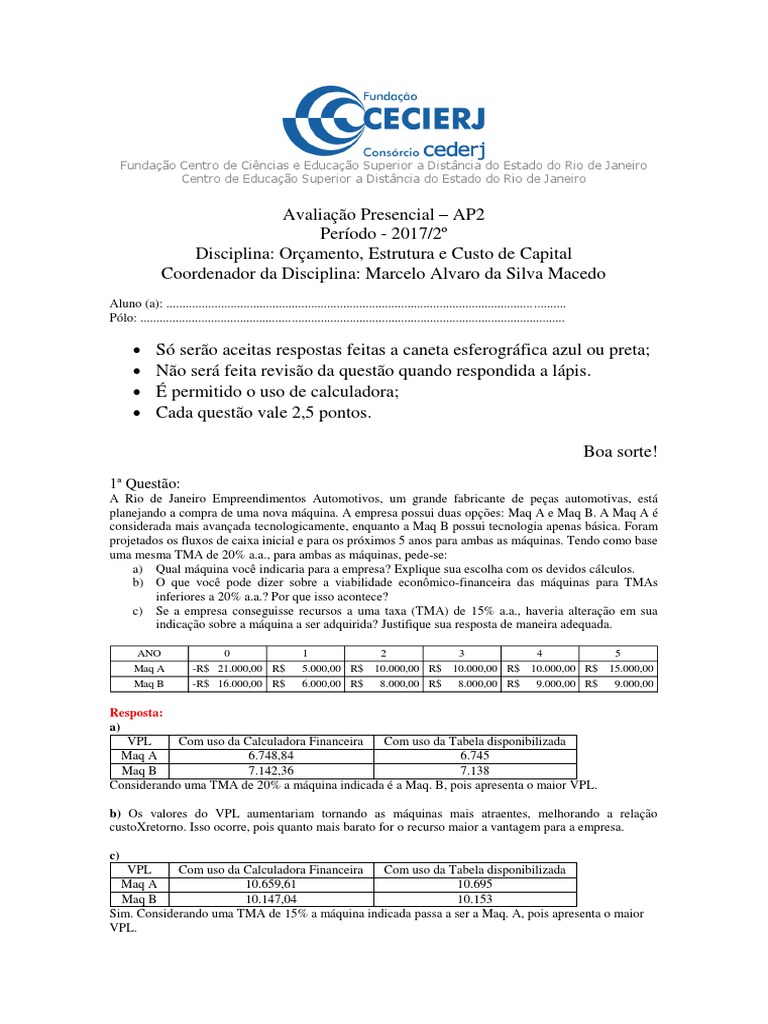 uma mesma TMA de 20% a.a., para ambas as máquinas, pede-se: