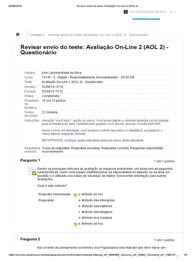 Revisar envio do teste: Avaliação On-Line 2 (AOL 2) -