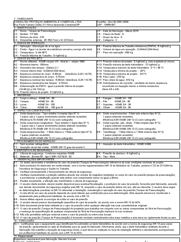 10.1 - Certificamos que o equipamento aqui identificado foi submetido ao teste hidrostático de acordo com a norma de segurança NR-13 para vasos
