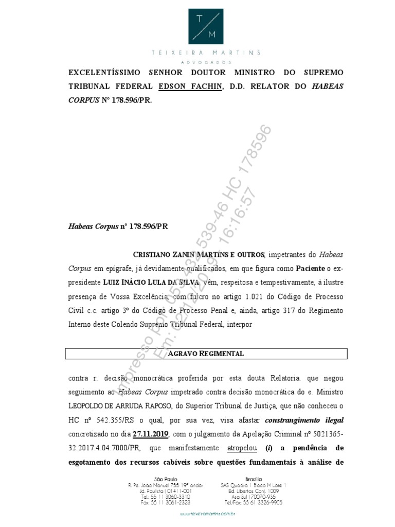 20.11.2019, esta Defesa interpôs Agravo Regimental nos autos do HC nº 542.355/RS.