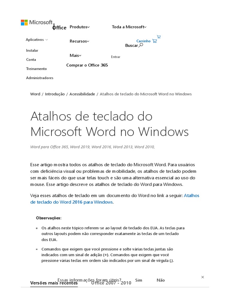 Word / Introdução / Acessibilidade / Atalhos de teclado do Microsoft Word no Windows