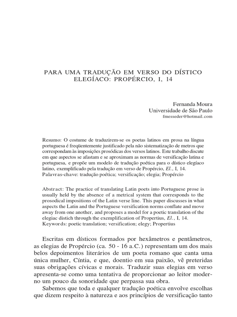 latino, exemplificado pela tradução em verso de Propércio, El., I, 14.