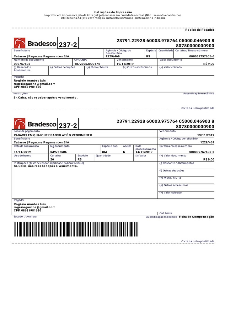 PAGÁVEL EM Q UALQ UER BANCO AT É O VENCIMENT O. 19/11/2019