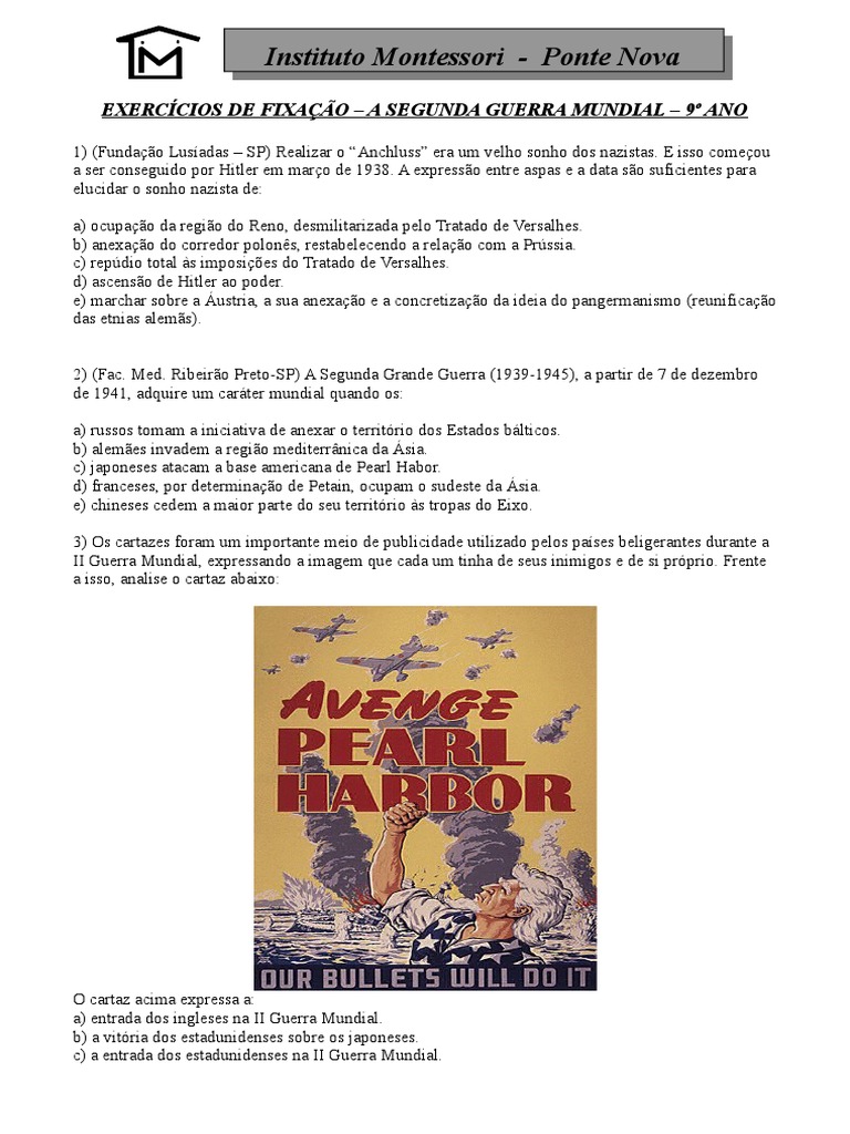 EXERCÍCIOS DE FIXAÇÃO – A SEGUNDA GUERRA MUNDIAL – 9º ANO