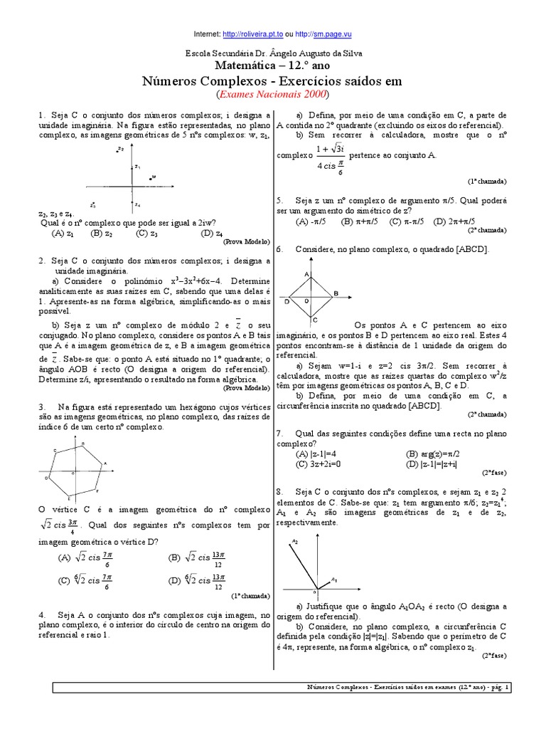Números Complexos - Exercícios saídos em exames (12.º ano) - pág. 1