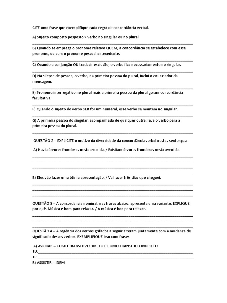QUESTÃO 5 – REDIJA uma frase, empregando cada verbo com a regência de acordo com o que