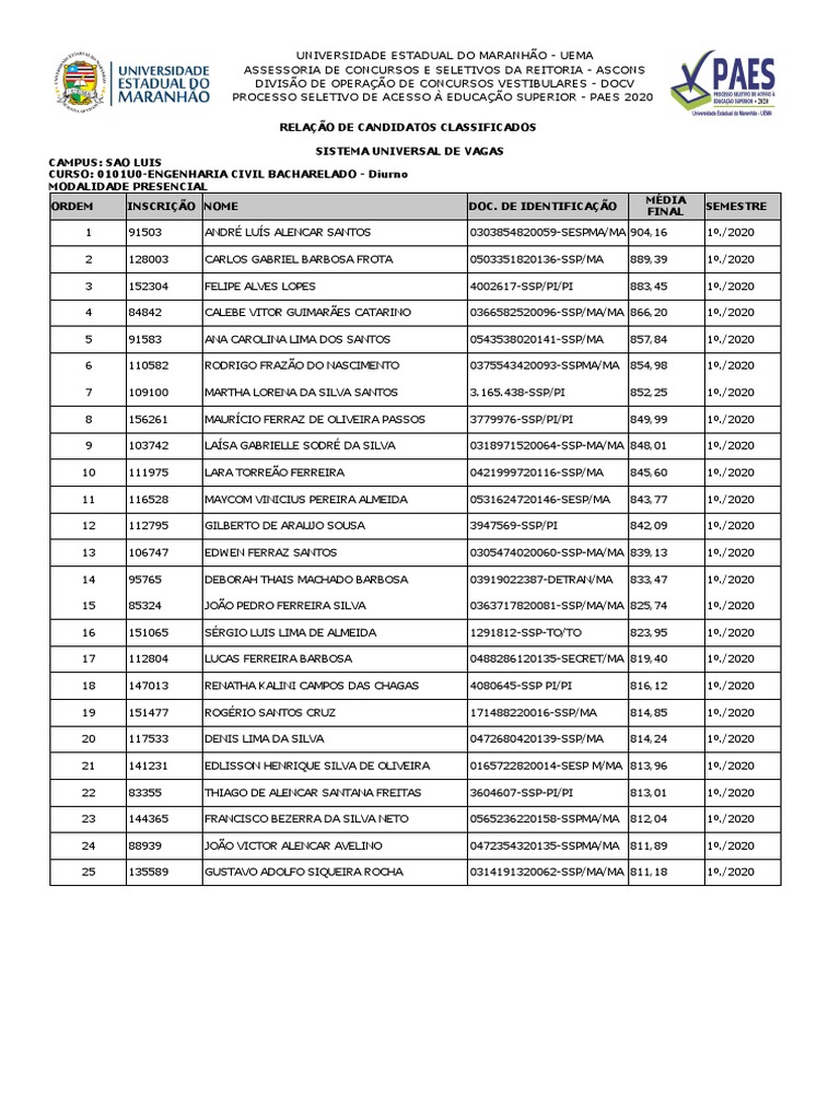 25 117470 GABRIEL SANTOS PEREIRA 0469461020123-SSP/MA/MA 728,31 1º./2020