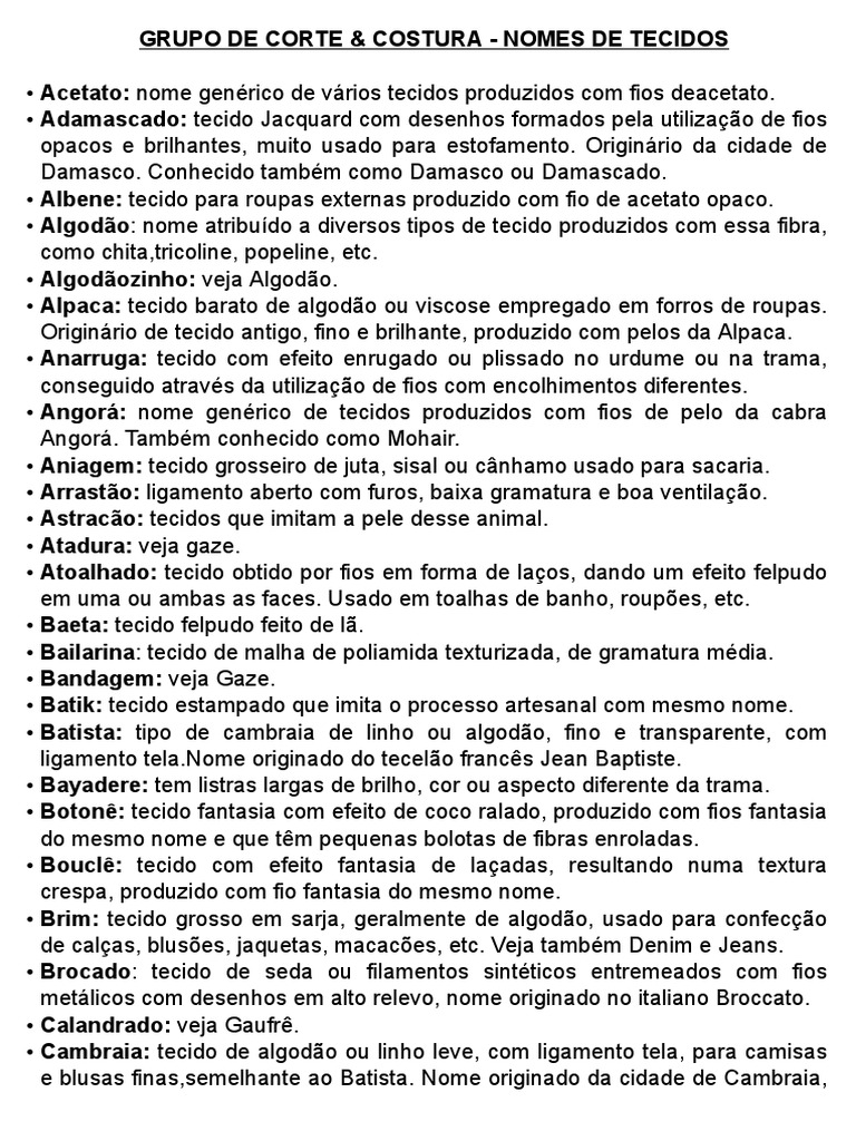 GRUPO DE CORTE & COSTURA - NOMES DE TECIDOS