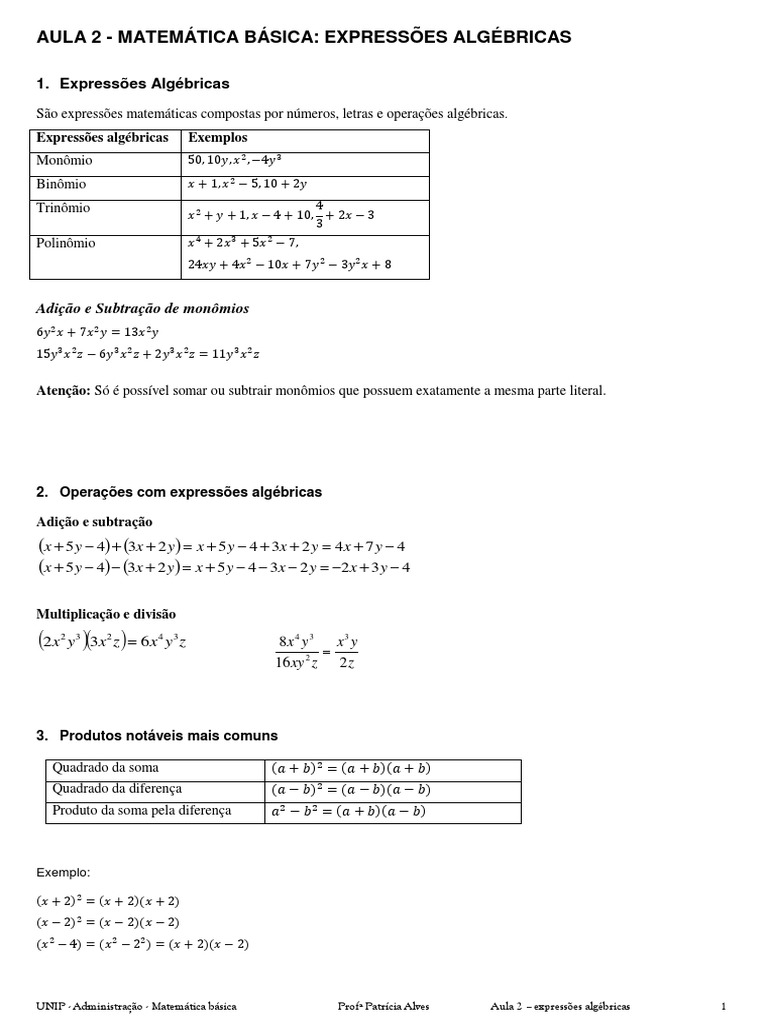 AULA 2 - MATEMÁTICA BÁSICA: EXPRESSÕES ALGÉBRICAS
