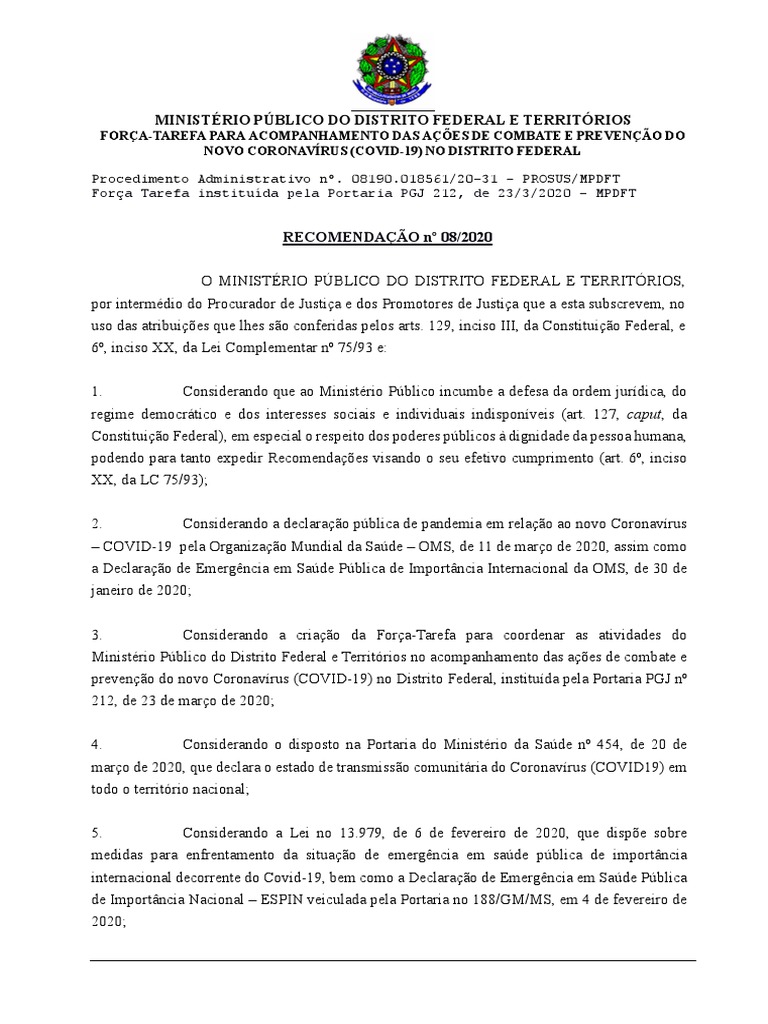 Força Tarefa instituída pela Portaria PGJ 212, de 23/3/2020 - MPDFT