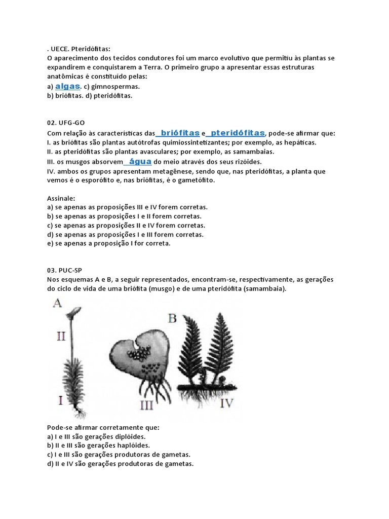 a) I e II ocorrem nas briófitas e pteridófitas.