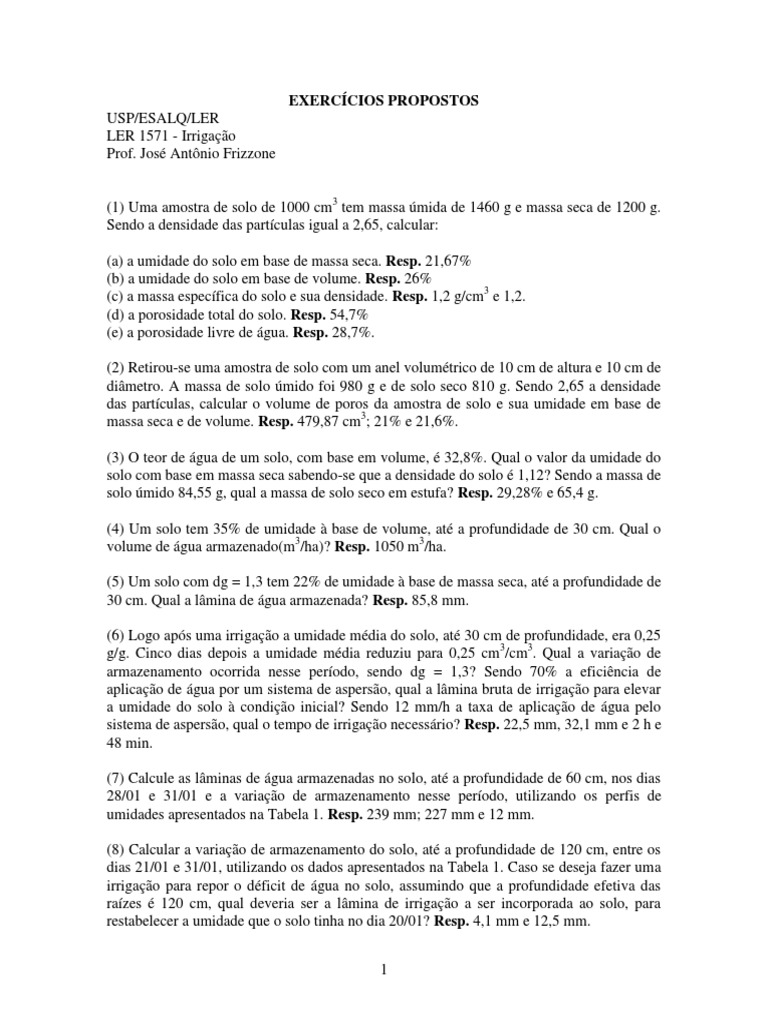 (b) As porcentagens de água disponível em massa seca e em volume. Resp. 13% e 15,6%.