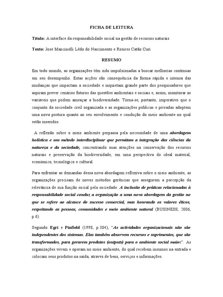 da responsabilidade social na gestão de recursos naturais tomando como referencial o