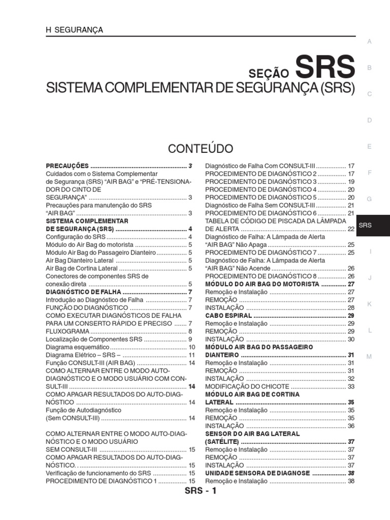 Precauções para manutenção do SRS Diagnóstico de Falha Sem CONSULT-III ................. 21