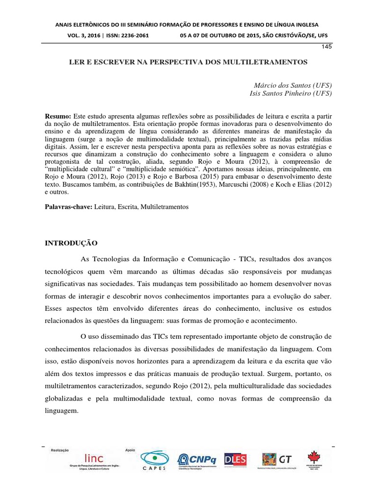 Palavras-chave: Leitura, Escrita, Multiletramentos