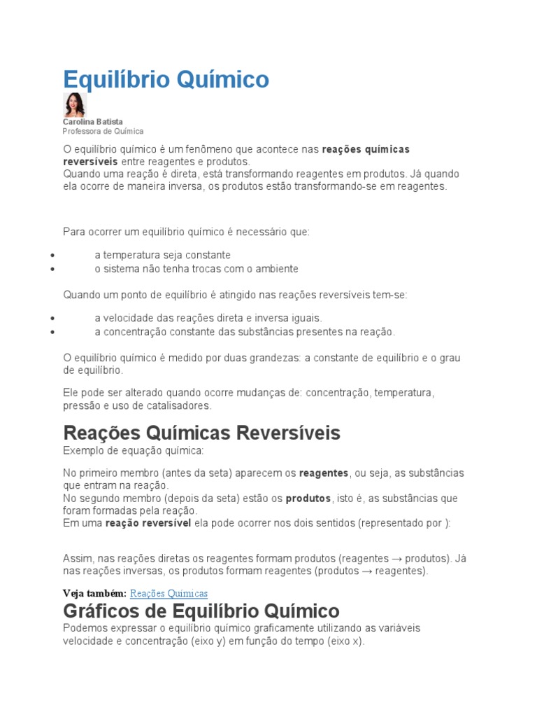 Quando o equilíbrio químico é atingido, a concentração das substâncias presentes na